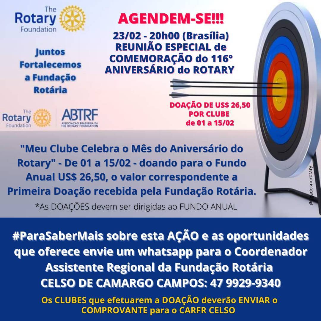 "Meu Clube Celebra o Mês do Aniversário do Rotary" - De 01 a 15/02 - doando para o Fundo Anual US$ 26,50, o valor correspondente a Primeira Doação recebida pela Fundação Rotária.