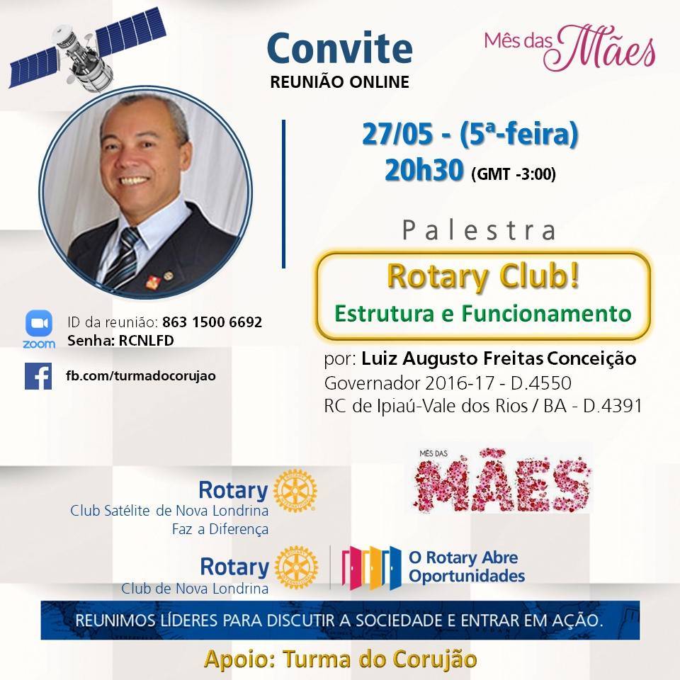 *Os Companheiros dos Rotary Clubs de Nova Londrina e Ipiaú-Vale dos Rios, estão convidando você para uma reunião Zoom agendada.*