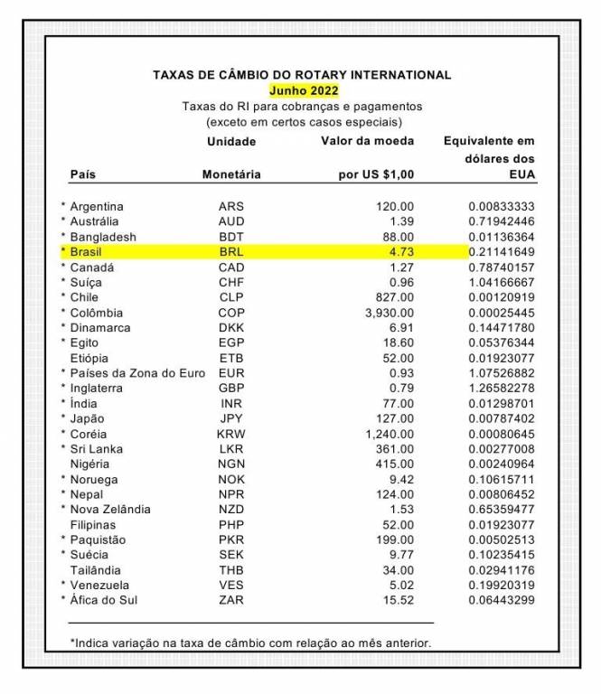 TAXAS DE CÂMBIO DO ROTARY INTERNATIONAL - Junho 2022