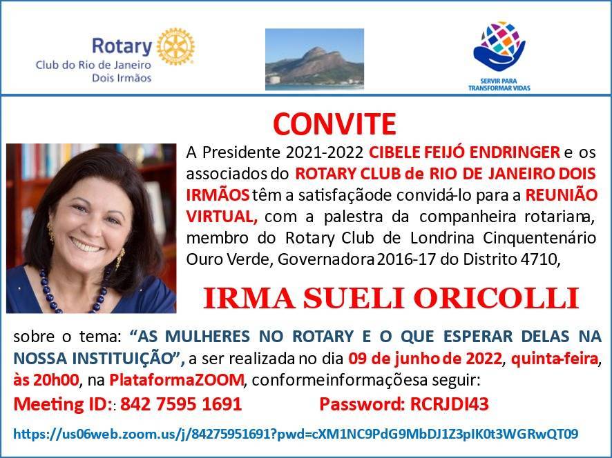 *A presidente 2021-22 CIBELE FEIJÓ ENDRINGER* e os Associados do *Rotary Club do Rio de Janeiro-Dois Irmãos,* têm a satisfação de convidá-lo para a *REUNIÃO VIRTUAL,* Zoom agendada.*